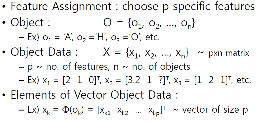 object data(X) 해당 객체의 속성들을 수치로 나열한다. 이는 벡터의 형태로 나열될 수 있다. n개의 객체의 p개의 속성에 대해 패턴 인식을 실시하며, object data x는 p차 벡터로 표현된다.
